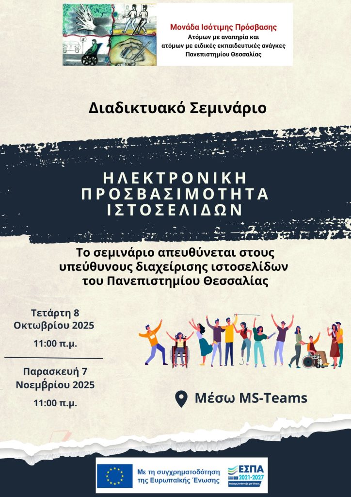 Η Μονάδα Ισότιμης Πρόσβασης Ατόμων με Αναπηρία και Ατόμων με Ειδικές Εκπαιδευτικές Ανάγκες σας προσκαλεί σε διαδικτυακό σεμινάριο με τίτλο